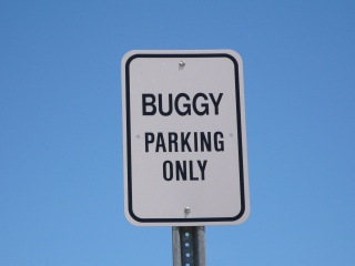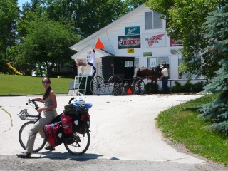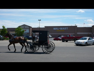 Aujourd'hui nous sommes passés à Middlefield, une ville au coeur d'une large communauté Amish. Et il est rigolo de voir que la ville comme les commerçants ont su s'adapter. Pas de piste cyclable mais des pistes "carrossables". Et même le supermarché géant Wal-Mart s'est doté d'un parking à buggy d'une cinquantaine de places !