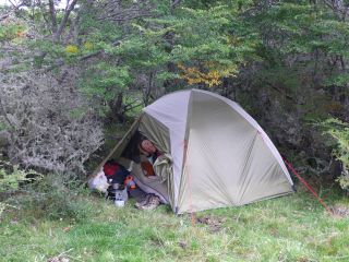 3 heures après notre arrivée a Calafate a vélo, nous voici donc repartis en voiture pour le célèbre glacier. On nous a prévenu qu'il faut éviter les lapins, car un accroc dans le pare-choc peut coûter cher a un touriste, donc Francis conduit très prudemment. L'arrivée est un peu complexe : d'abord le garde nous dit de nous garer sur un parking ou ils font des travaux bruillantissimes toute la nuit, puis nous faisons mine de repartir et plantons notre belle tente bien étanche dans un champ de calafates (arbuste épineux qui donne des petites baies violettes très appréciées dans ce pays et dont le goût se rapproche des myrtilles). Nous récoltons quelques trous dans notre belle tente toute neuve. La nuit ne porte pas toujours conseil !