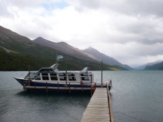 Le lendemain le bateau arrive a 11h. On nous explique qu'il va d'abord faire le tour du lac pour voir si les ermites qui habitent autour se portent bien. Retour prévu à 17h. La plupart des gens montent sur le bateau. Nous, on préfère rester sur la terre ferme, le bateau toute la journée, bof. Le bateau revient à 20h. Il fait nuit et nous embarquons à l'aide d'un zodiac. Puis c'est le tour des vélos, qui arrivent à 5, entassés les uns sur les autres. Tous les cyclistes sont un peu crispés à l'idée que leur vélo soit attrapé par un câble, où qu'il tombe et disparaisse dans les eaux glacées du lac O'Higgins.