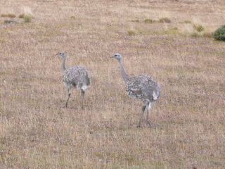 Le lendemain matin, Francis est malade. Nous partons tout de même vers midi à l'assaut de la Patagonie. Nos montures fraîchement graissées filent malgré le vent de face. Sur une piste, nous découvrons la faune locale : des nandus a foison (sortes d'autruches), nombre de gros oiseaux volants non identifiés (OVNI), des guanacos (le guanaco est une sorte de lama local et contrairement à ce dernier, il est sauvage) et d'autres gazelles au long cou.