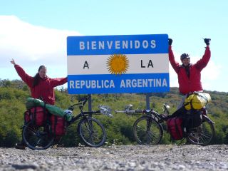 Nous atteignons vite la frontière argentine, un peu tendus car nous voyons sur la route des panneaux indiquant qu'il est interdit d'importer des produits frais. Hors nous avons fait nos courses a Puerto Natales, pensant ne rien trouver avant plusieurs jours. Nous avons donc dans nos sacoches tout ce qu'il ne faut pas pour la douane, mais qu'il nous faut pour survivre d'ici à El Calafate : fruits et légumes, charcuterie et fromage. A la douane chilienne, ils nous mettent juste un tampon de sortie sur notre passeport mais contrôlent aux rayons X tous les bagages entrants. Nous avons donc un peu peur pour l'entrée en Argentine, mais les argentins n'ont pas de rayons X et le douanier nous laisse passer sans fouiller nos vélos. Ouf !