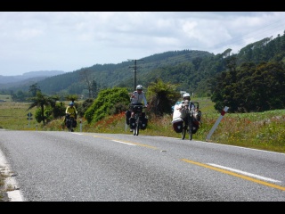 Notre descente de la côte s'est très bien passée. Il a finalement fait beau et nous avons pédalé plusieurs jours à plusieurs, avec Murray l'Australien et Shaha l'Israelien. C'est d'ailleurs assez rigolo, phénomène de mode, la Nouvelle-Zelande est immensément populaire chez les Israeliens et on en croise en permanence.