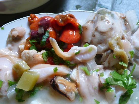 Puis nous avons pris le chemin du marché central pour déjeuner. A la carte, il y avait des huitres pas chères, mais nous avons pensé que c'était sanitairement risqué dans ce petit resto pas très clean. Nous avons donc commandé ce qu'on pensait être une salade de fruits de mer cuits. En réalité, ils sont arrivés crus dans notre assiette. Un peu apeurés et un peu ecoeurés par ces bestioles étranges, nous avons tout mangé (avec beaucoup d'oignons et de citron quand même). Et c'était bon ! Et nous ne sommes même pas tombés malades.